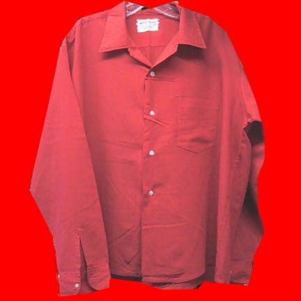 Chest measures 52″. Size marked is XL, 17-17 1/2. Hot red with slight Orange tint.
