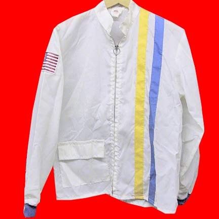The Great Lakes Jacket White with Blue and Yellow racing stripes windbreaker with American flag arm patch