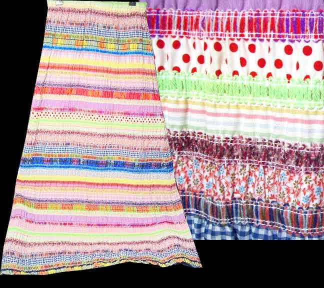 Various Cloth Remnant Strips with Stitched Colored Ribbons inbetween Full Length Skirt